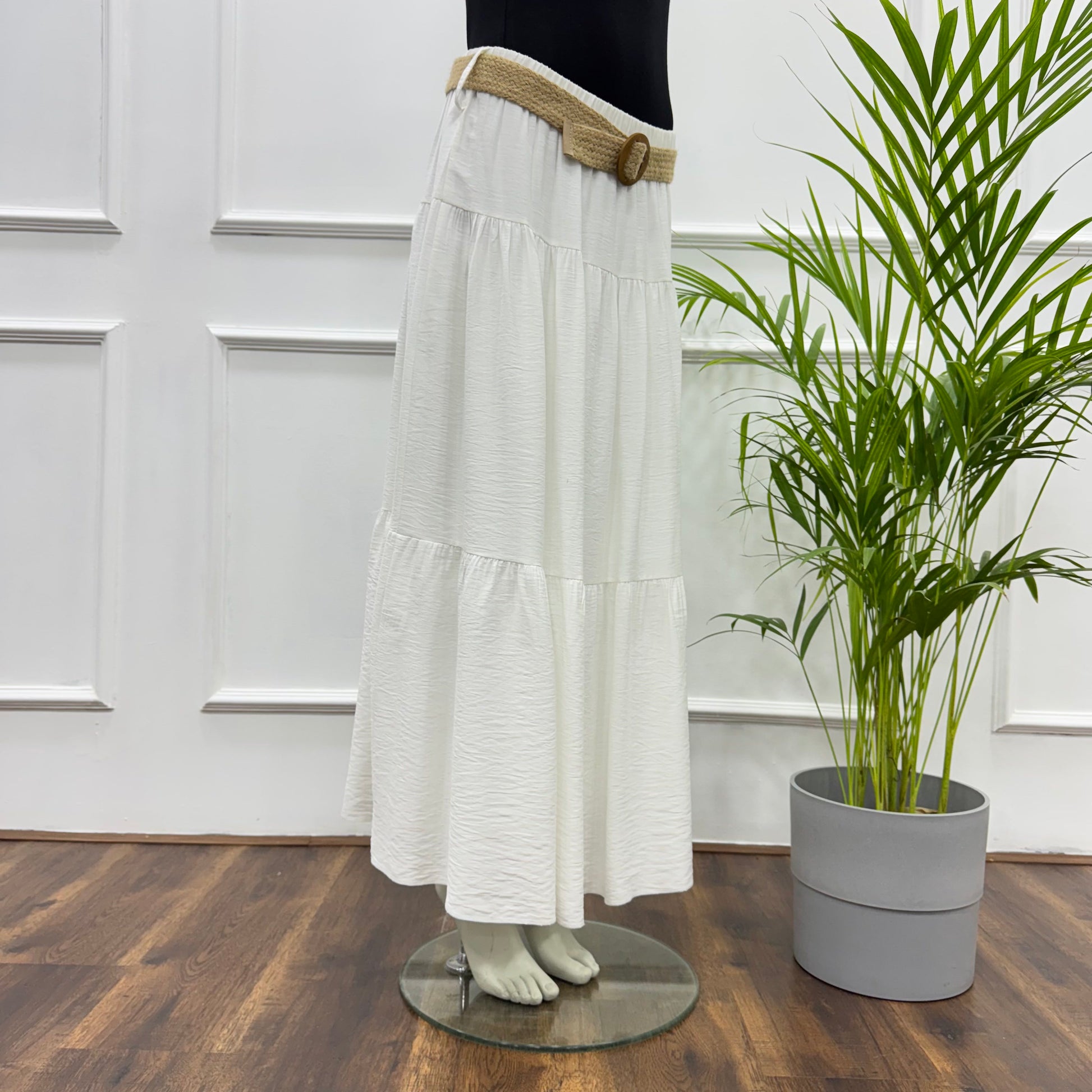 Elevate your wardrobe with this tiered maxi skirt, designed for effortless elegance and versatile styling. Featuring a flowy A-line silhouette, this skirt offers a comfortable yet flattering fit, perfect for all-day wear. Crafted from linen, it ensures a lightweight feel, while the inner lining enhances coverage, preventing transparency without compromising comfort. The elastic waistband provides a secure yet flexible fit, allowing ease of movement and all-day comfort. Ideal for casual outings, yet refined enough to be paired with a blazer for a polished, semi-formal look. Its all-season versatility makes it a timeless staple—light and airy for summer, yet easy to layer in cooler weather.